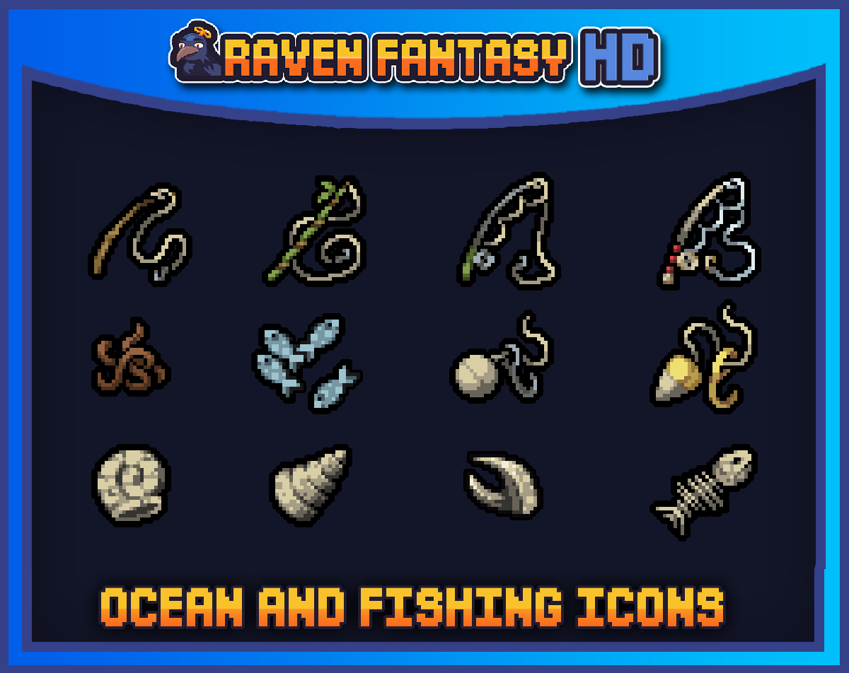 A follow-up asset creation for the Raven Fantasy HD series, now featuring high-resolution icons of fishing tools and fish of the most common found in many RPGs and MMORPGs! Time to work on that fishing minigame! Feel free to suggest new designs for a future asset!